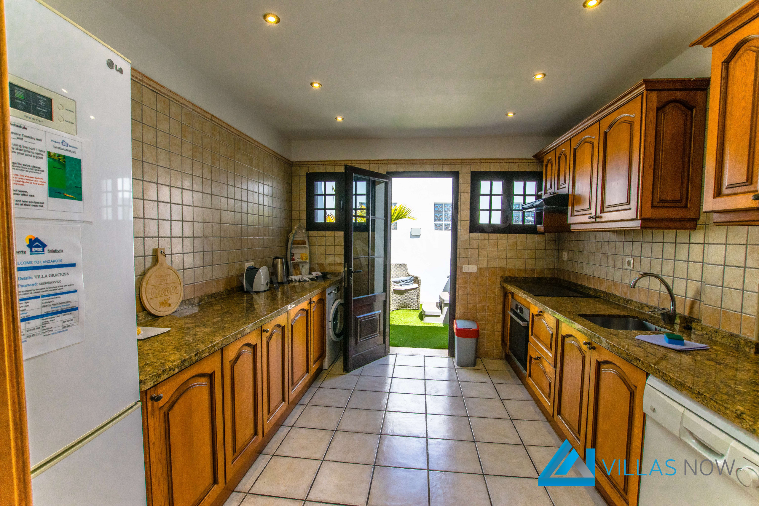 La cuisine est très bien équipée et dispose de beaucoup d'espace de travail pour la préparation. Elle dispose des équipements suivants : lave-vaisselle, lave-linge, micro-ondes, frigo-congélateur, plaque vitrocéramique et beaucoup d'ustensiles pour satisfaire les plus enthousiastes des chefs. De l'autre côté de la cuisine, vous avez une zone gazonnée avec un jacuzzi, un canapé et quelques plantes. Il s'agit d'un espace de plein air qui vous permet de profiter du soleil ou de regarder les étoiles la nuit, tout en profitant du jacuzzi dans le climat parfait qu'offre Lanzarote.