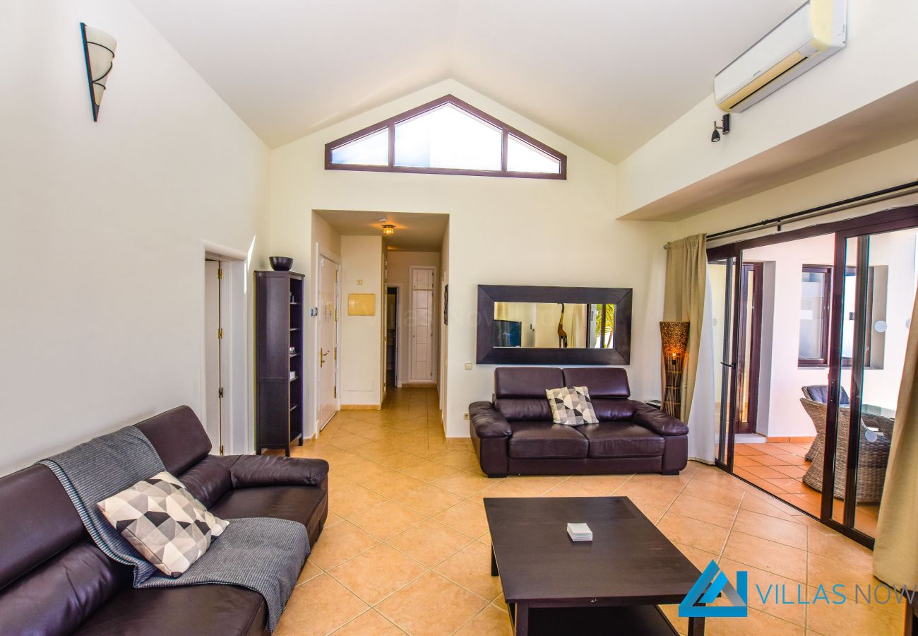 The villa has three bedrooms, two being King rooms and one being a twin room. The Master room has an ensuite and separate patio doors leading out to a terrace area with a table and comfortable seating, with access to the well-maintained garden. The Ensuite bathroom has a shower, toilet and sink. Coming out of the bedroom you are in a corridor with built-in wardrobes a second bathroom with a toilet and sink in and the doorway to a twin bedroom.