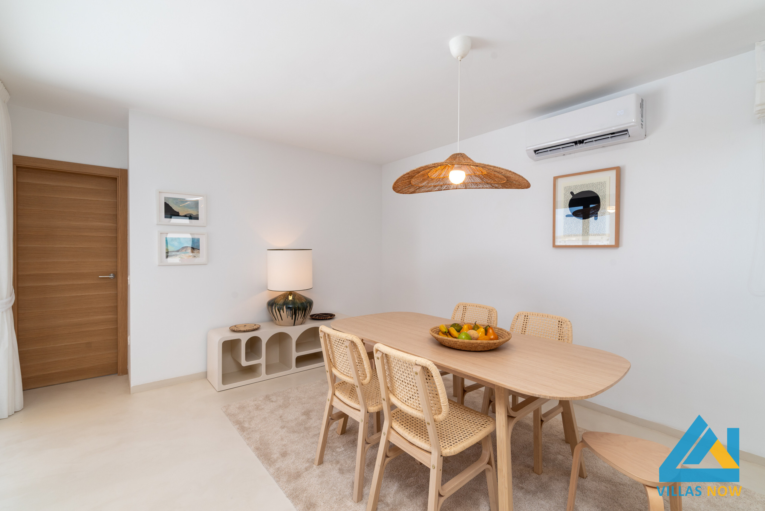 Inside, the open-plan layout flows effortlessly from the sleek kitchen to the spacious lounge and dining area, with cool tones, natural light, and subtle design touches inspired by César Manrique. Air conditioning throughout keeps the space comfortable after a day in the Lanzarote sunshine.
